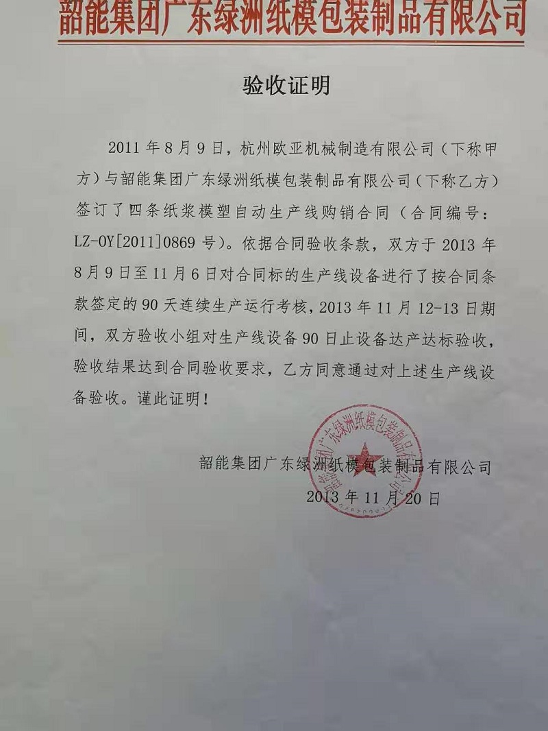 韶能集團廣東綠洲紙模包裝制品有限公司,從2010年開始,前后分4期共購買歐亞機械A(chǔ)E920型全自動紙漿模塑餐具設(shè)備生產(chǎn)線72臺,全部達產(chǎn)達標,并通過驗收。廣東綠洲公司是歷史悠久的著名紙漿模塑制品生產(chǎn)企業(yè),生產(chǎn)高品質(zhì)的紙漿模塑制品,是國內(nèi)紙漿模塑制品生產(chǎn)企業(yè)的標桿。